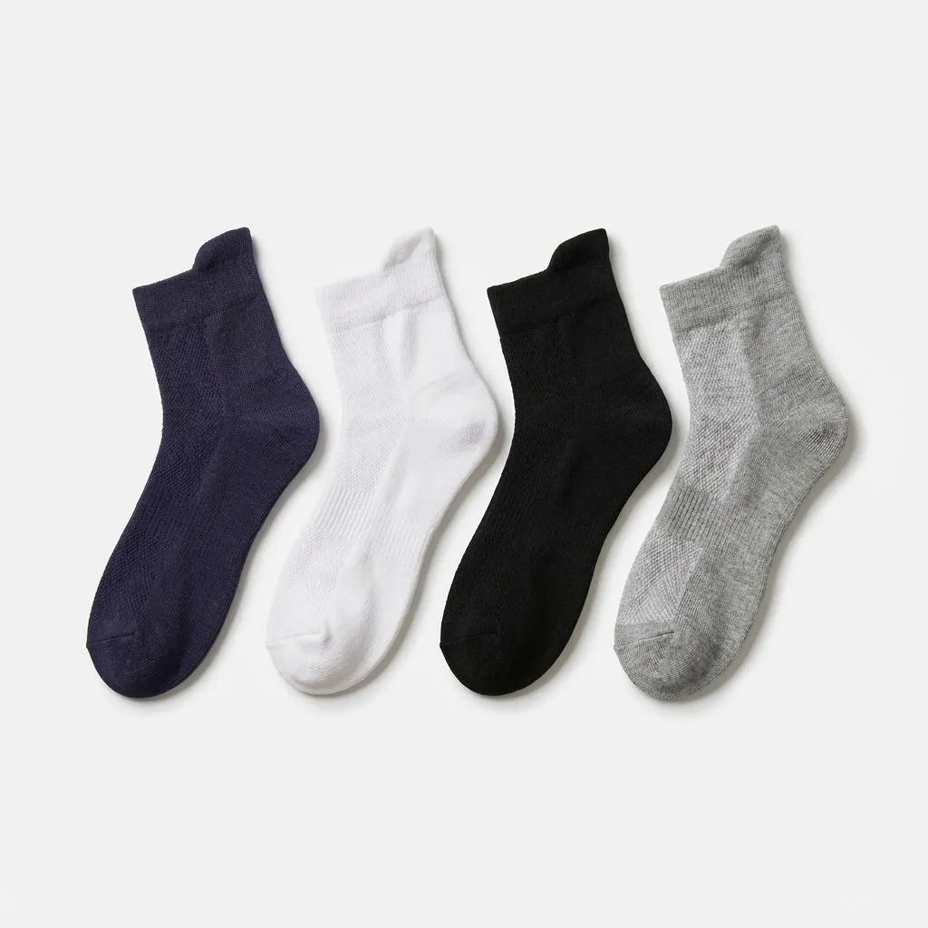 ✅ Material: Premium bamboo fiber blend with stretch fit ✅ Colors Available: White, Black, Navy, Grey ✅ Fit: Unisex, ankle length with comfortable elastic band ✅ Design: Softly cushioned sole for all-day comfort ✅ Care: Easy machine wash & quick dry
