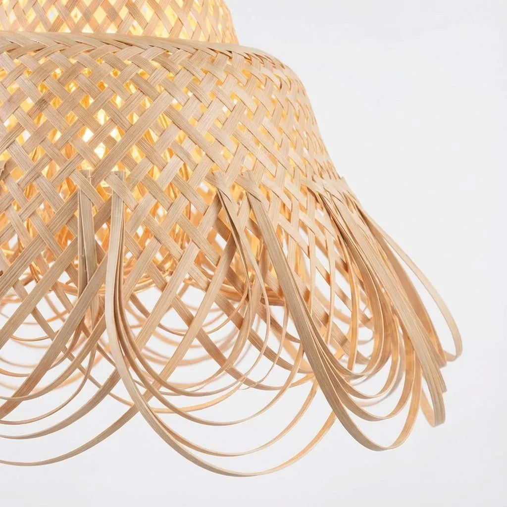 ✅ Material: Bamboo ✅ Color: Natural bamboo tone ✅ Design/Shape: Petal crown / layered woven pendant ✅ Mount Type: Hanging ceiling lamp (pendant style)